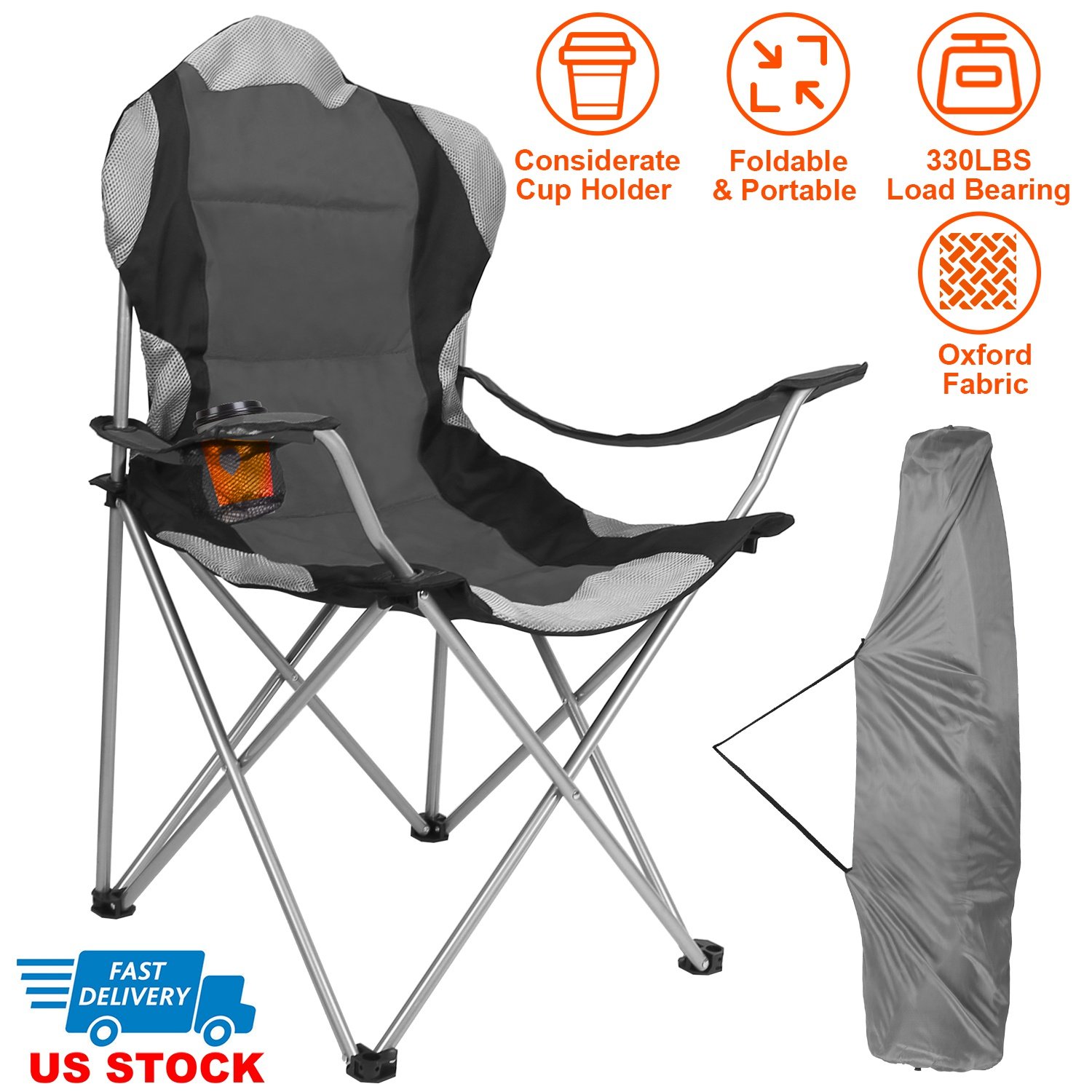 Let’s enjoy the fun and leisure time in outdoor life. Camping chair with sturdy steel frame creates the perfect balance between comfort and functionality. This camping chair is perfect for camping, sports, fishing and travel. Premium Oxford fabric with steel tube ensures you 330lbs max load. Cotton padded seat, armrest and back renders you comfortable seating. Set up quickly, can be opened and folded within seconds and packs easily back into its carry bag for storage or travel. Mesh cup holder keeps a beverage within reach. Carry bag included for easy transport and storage.